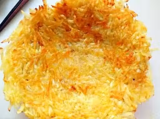 鍋里加入少許油,中小火,把土豆絲均勻的放入鍋內,攤成餅狀(最好攤薄些),用鍋鏟壓實,待土豆餅面呈金黃色,翻過去煎另外一面(注意!最好用不粘鍋煎!)