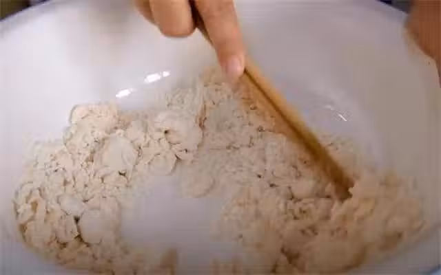 2. 我這是 200g 的普通麵粉,把酵母水倒入盆里,邊倒邊攪,再拿筷子把粘在面盆底部的麵粉刮下來。