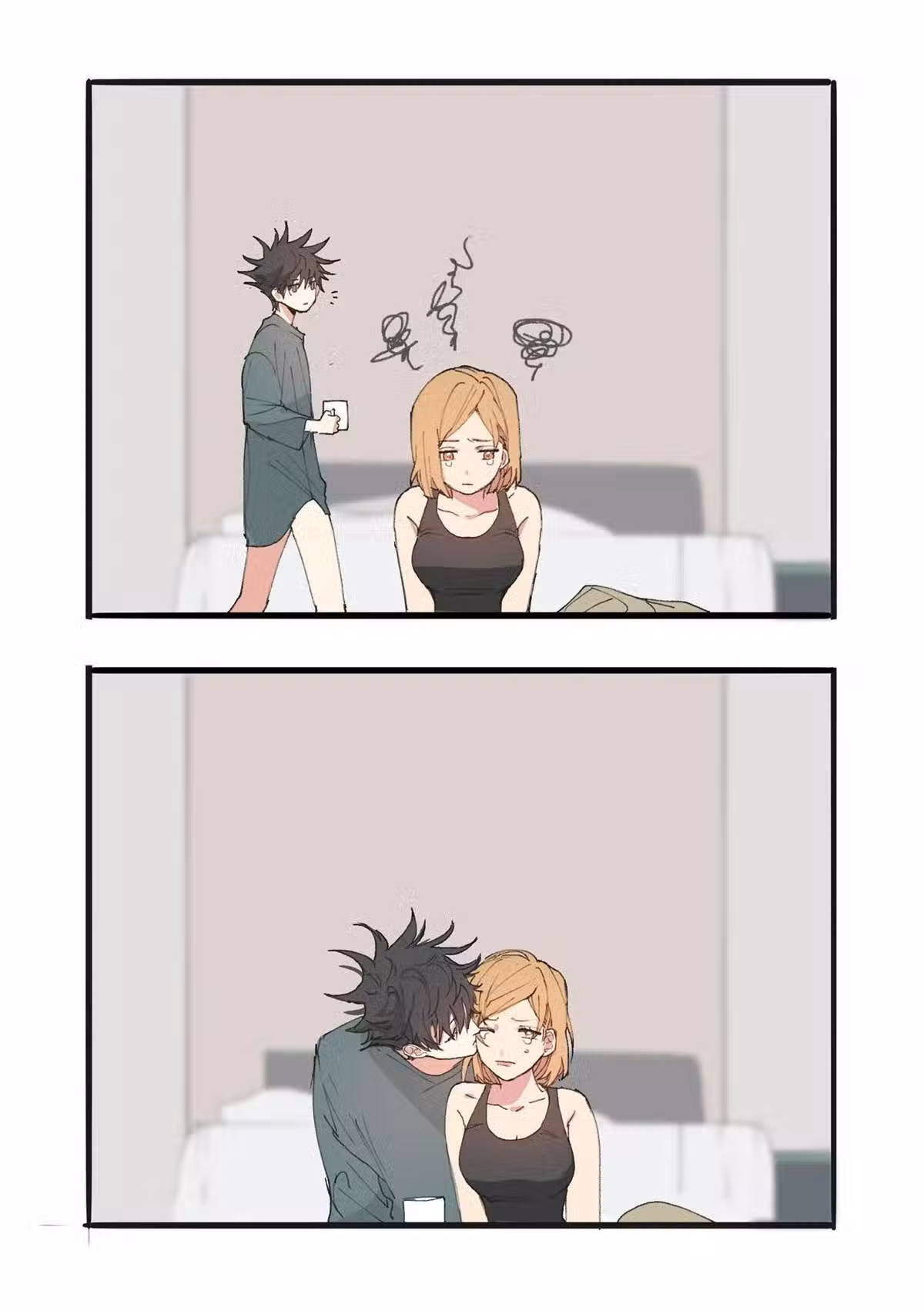 釘崎野薔薇平日裡是「釘哥」,平日裡兇猛有活力。但是,今天心情低落,顯得鬱郁寡歡。心情不好的她忍不住流淚,活力電量用完了,急需充電。伏黑惠見到薔薇活力低下,立即親她,想讓她心情好起來。(話說伏黑你褲子呢?)