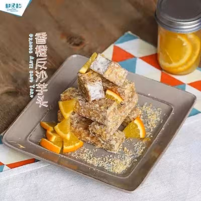 芋頭300g,柳丁1個(5g橙皮碎末),食用油適量,白糖60g,鹽1g,水30g