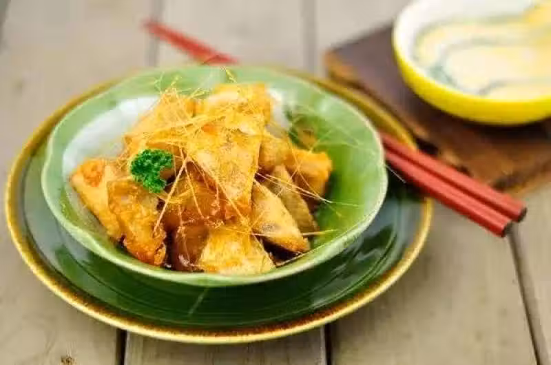 2、油鍋開始冒點泡泡就下鍋炸(不要太熱,會幹掉,等一下還要炸第二次),變黃色就撈起來