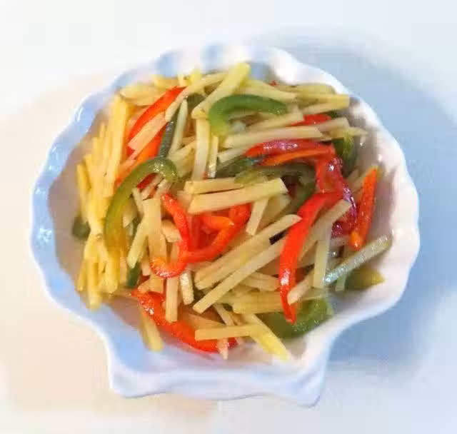 材料:土豆1個、青椒、紅椒各1個,大蒜、生抽、油、鹽
