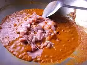7. 翻炒均勻,加入鹽和少許醬油調味,加入半碗濃椰漿,撒入麻風柑葉絲