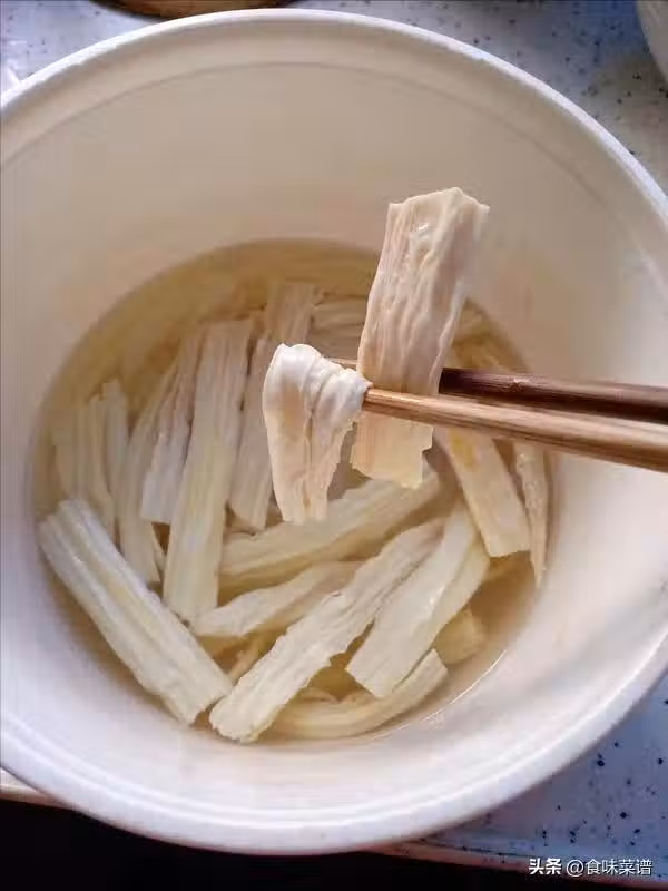 泡發腐竹,最忌使用熱水,加涼水沒過腐竹即可,浸泡4個小時左右。