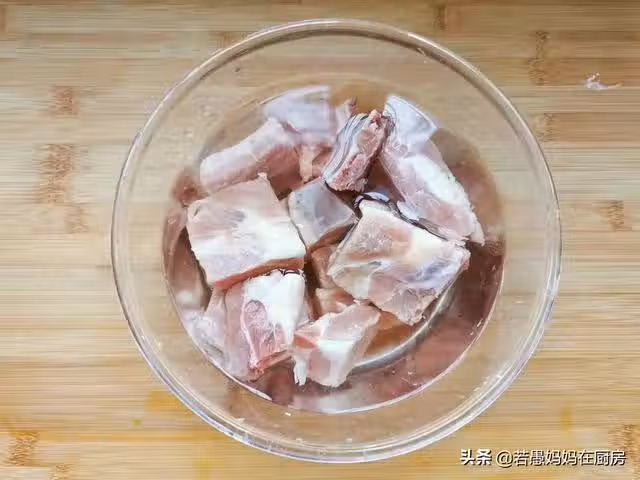 2、小排跟清水一起入鍋,大火煮開,滴入一些料酒,繼續煮,煮出血沫,撈出再次清洗乾淨。