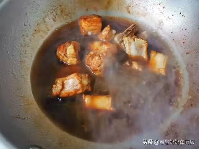 8、排骨熟透,改大火收汁,將湯汁收汁黏稠發亮的狀態,撒上一些芝麻即可出鍋。