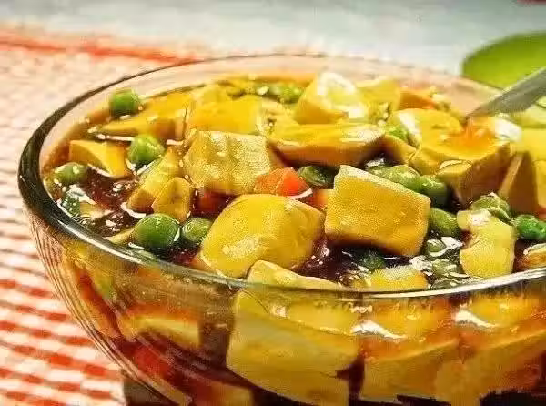 豆腐一塊半,豌豆、胡蘿蔔丁少許,味素、花椒水、醬油、白糖各少許