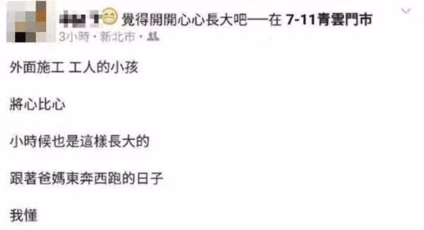 看著孩子趴在椅子上,店員擔心他會著涼,就將自己的制服脫下來,蓋在孩子身上,並將這一幕拍下來,感嘆道:「我小時候也是這樣,跟著爸媽東奔西跑。」