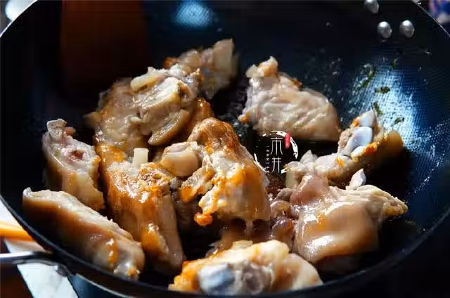 3、豬蹄沾滿糖色後,加入蔥段,八角,蒜片,薑片,干辣椒,香葉,換大火,繼續翻炒3分鐘入味。