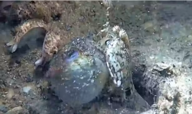 此時的河豚瞬間就像泄了氣的皮球,感覺身體被掏空,沒有了大肚子的庇護,它瞬間就變得體積小了很多,直接就被皮皮蝦拖入了洞中,這河豚簡直是太難了。