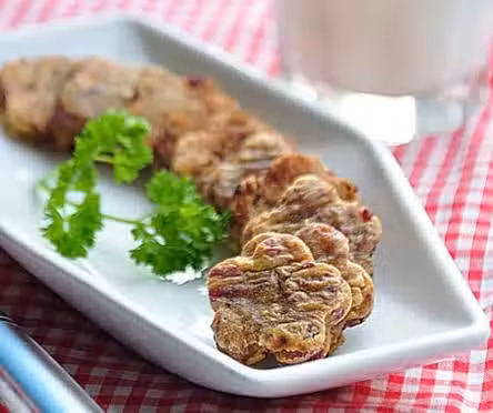 3、平底鍋燒熱,抹油,將麵糊倒入,用勺背慢慢按壓成薄薄的餅。小火,蓋蓋子,慢慢將兩面煎成金黃色。小模具取形即可。