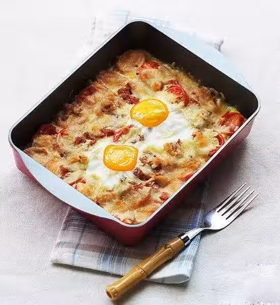 雞蛋3個、聖女果15個、培根2片、馬蘇里拉奶酪100克、黑胡椒2克、橄欖油少許