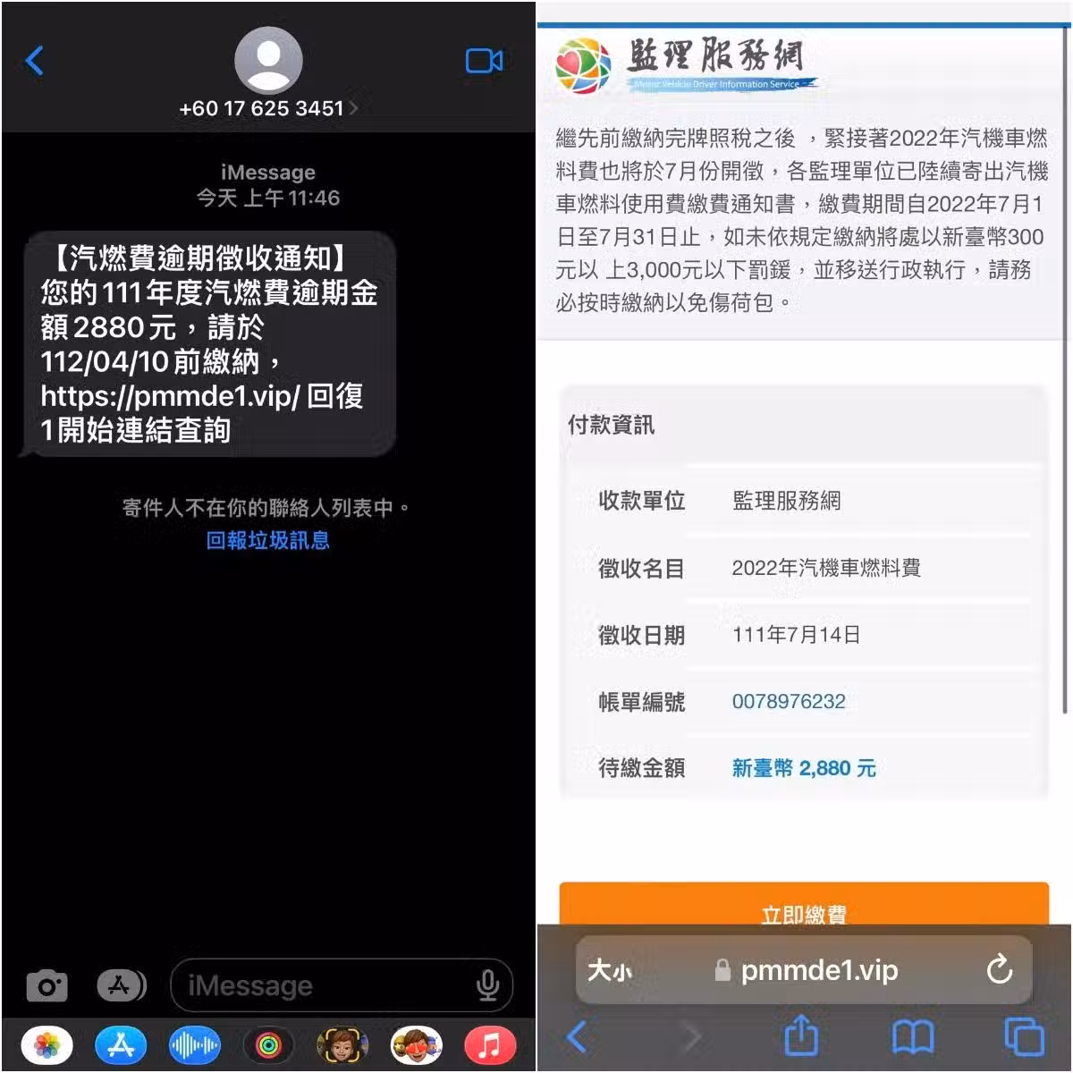 一名男網友在臉書《爆料公社》貼出兩張圖片,一張是手機iPhone收到「汽燃費逾期徵收通知」,指出111年度汽燃費逾期金額2880元,要求4月10日前繳納,並給了一串「以.vip/結尾」的網址,且回覆1開始連結查詢。