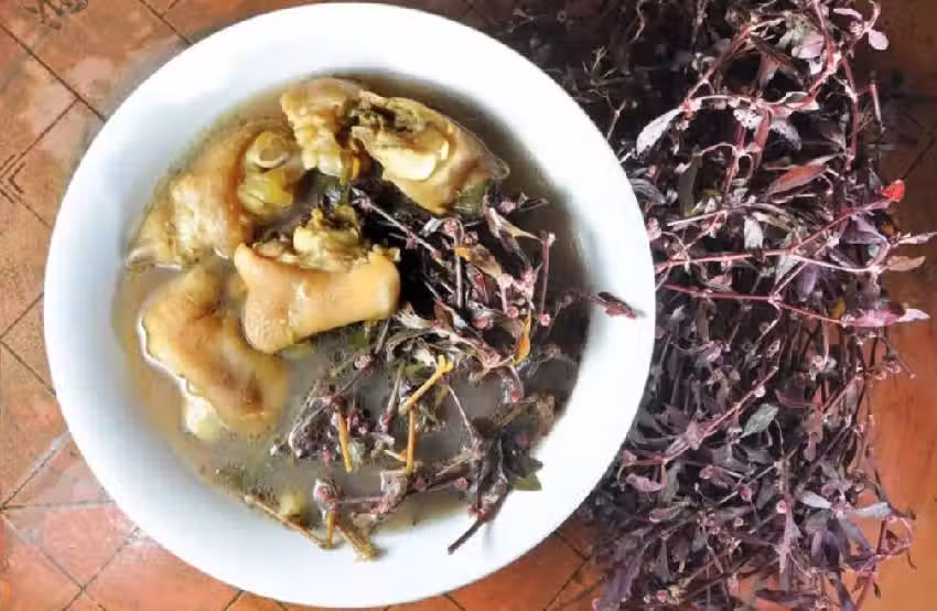 材料:紅田烏50克(連莖)、豬腳尖1副、姜4片、米酒1碗、清水2碗。