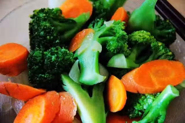 4、鍋底鋪油少許,放洋蔥,香氣出來以後扔進西蘭花和胡蘿蔔,爆炒,鹽雞精少許,出鍋。