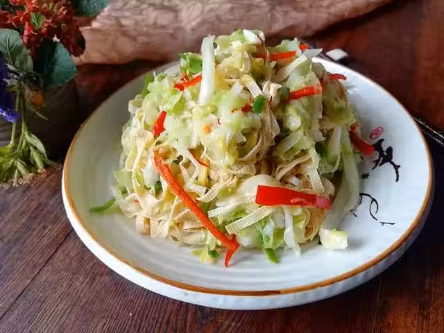 包菜1/2棵、尖椒3個、豆皮3張、油鹽適量、蔥1段、大蒜2瓣、花椒適量、米醋少許、