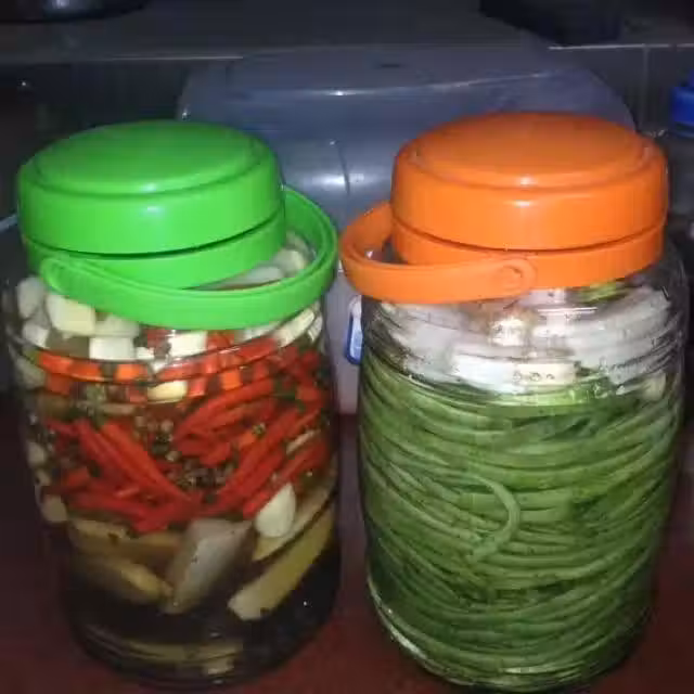 白蘿蔔切塊,缸豆盤起,姜,蒜,辣椒下入腌罐裡面,所有工具用開水燙下,要無水無油