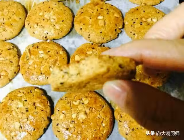 4、做好的花生餅放在烤盤上,表面刷上蛋黃液。烤箱180℃提前預熱10分鐘,放入花生餅烤20分鐘,顏色金黃就可以出鍋了,吃起來香酥可口,營養美味。