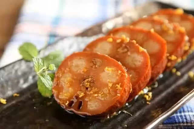 將填入糯米的藕放鍋中,加水浸沒,把火開到最大,等水沸後,改成中小火,並加入少量紅棗和紅糖,小火煨兩三個小時後,撈起放涼切片,澆上桂花蜜,風味絕佳。