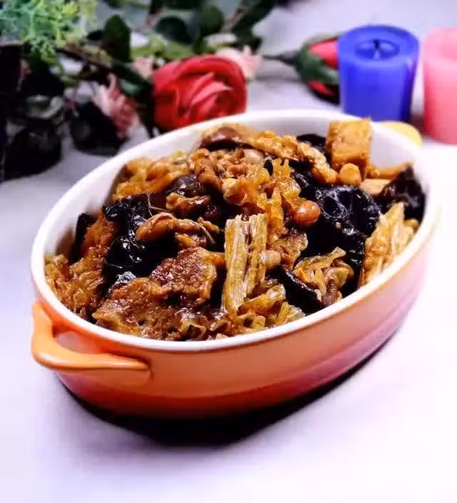 小麥麵粉、乾酵母、清水、水發木耳、水發銀耳、水發香菇、水發腐竹、泡花生米、泡核桃仁、冬筍片、醬油、白糖、精鹽、味精、胡椒粉、香油、八角、烹調油、清水