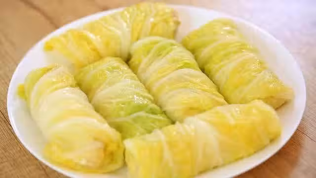 3、 將調好的餡兒放在白菜葉上,捲成卷,蒸鍋中的水燒開後,轉中火蒸10分鐘即可上桌。