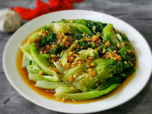 4、凈鍋放少許底油,油熱後下蒜末爆香,加蚝油、白糖、醬油,勾薄薄一層水澱粉燒開後淋在生菜上即可。