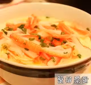 2. 蒸到一半熟的時候,把蟹柳撕碎,撒在上面,在繼續蒸到全熟,撒上蔥花就可以。