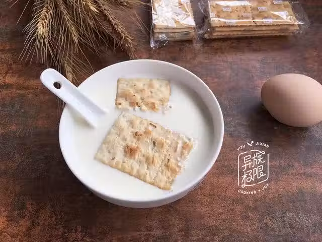 餅乾是今天額外加餐,蘇打餅乾要趁著牛奶溫度在80°以上時放入,這樣乾澀的餅乾能快速吸取水分,水溫越高吸取的速度越快。水溫低浸泡的時間相對要長些。