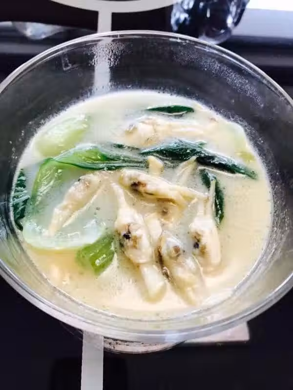 大火煮開之後小火再煮10分鐘左右、喜歡放點小油菜的可以放點菜、出鍋就可以啦、喜歡濃點的可以多煮會、熟了再放菜、要不菜都爛了!湯煮出來是白色!看上去就好喝自誇一下