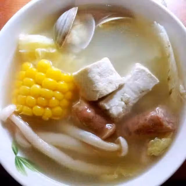 廣式臘肉3根;白蛤200g;豆腐150g;各種蘑菇150g;玉米1根;娃娃菜2小顆;生薑少許;大料一個