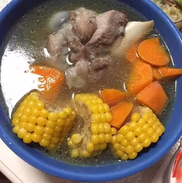 用料:豬骨棒2個;玉米2個;胡蘿蔔1個;蔥1顆;姜5片;蒜2瓣;料酒1勺;