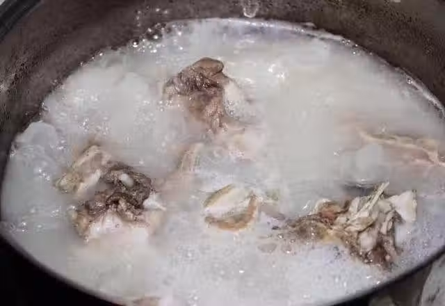 鍋中煮開水,下料酒和薑片,水開後下豬骨頭焯掉血水;