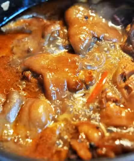 4中小火炒香鍋底。放入豬蹄翻炒數下後,加入生抽、料酒、冰糖。