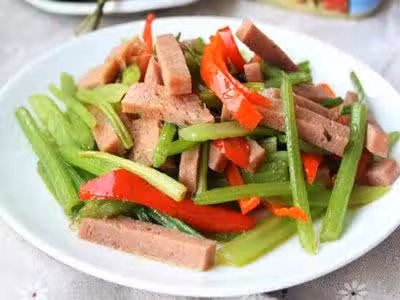 用料:西芹400克、午餐肉200克、紅尖椒1個、食鹽1小匙、牛肉粉1小匙、植物油2大匙