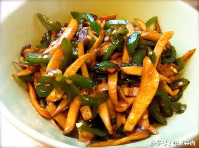 7、 青椒和杏鮑菇都翻炒之後加入少許雞精拌炒均勻即可。