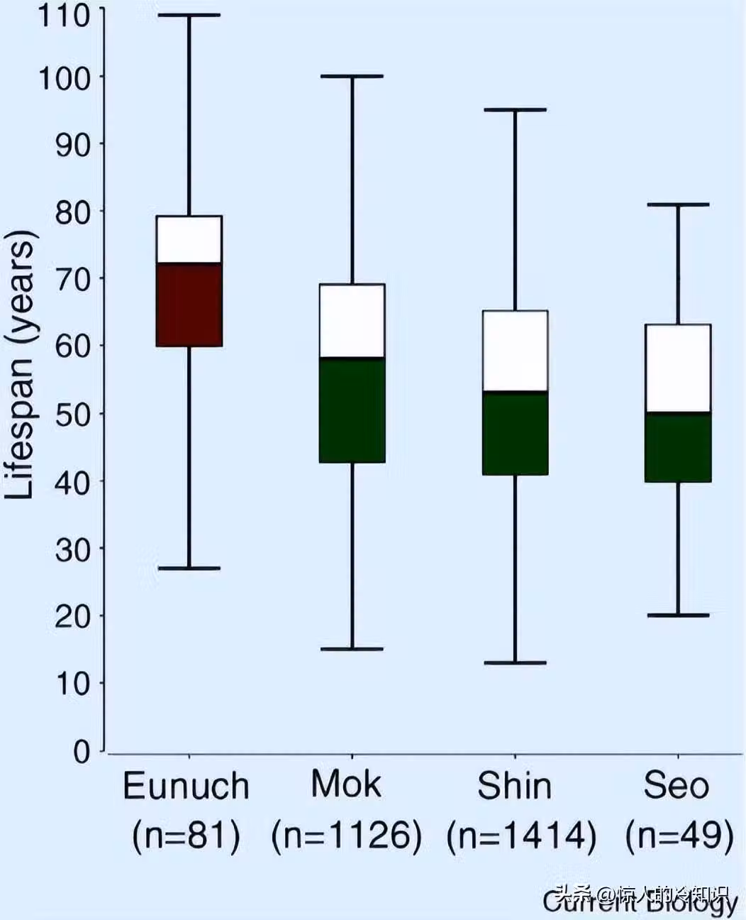 結果發現,這81位太監的平均壽命為70歲左右, 幾乎與現代人的平均壽命相當。相比之下,其同時代正常男性的壽命僅在50齣頭。也就是說, 太監比普通男性,平均可以多活近20年。
