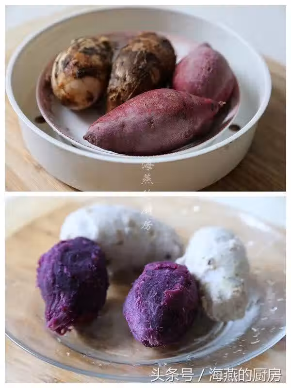 1,紫薯和芋頭清洗乾淨後放入蒸鍋中