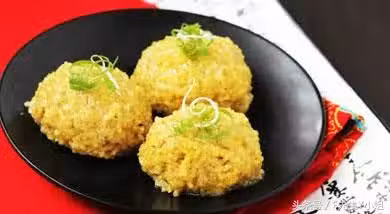 3、用手將肉餡揉成小圓球,放入黃米中滾一滾,讓其均勻沾上一層米,並用手輕輕按壓表面,讓米粒與肉餡結合緊密些;
