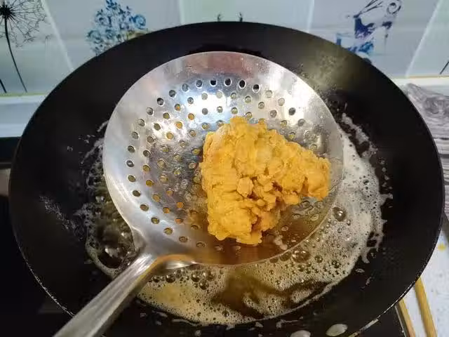 2、炸雞裹粉中要加麵粉、玉米澱粉和土豆澱粉三種粉,還要加少許鹽,這樣表皮才會酥脆好吃,越嚼越香。