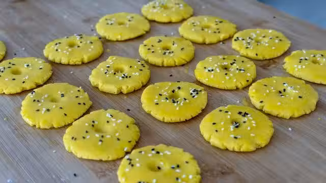 8、撒上黑白芝麻,烤盤放上油紙,放入做好的生胚,烤箱提前預熱10分鐘,放入桃酥,普通平爐烤箱175-180度烤20分鐘,風爐烤箱建議150度18分鐘,具體的溫度還是要根據自己家烤箱的溫度來調整,烤好之後取出來放十分鐘左右。