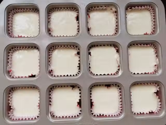 拌好的麵糊從20厘米的高處緩緩倒入模具中,倒八分滿,拿起模具輕振幾下。