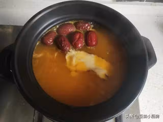 4、煲湯最好使用砂鍋,鍋里加入足夠多的水,放入雞肉、紅棗、薑片,倒入南瓜泥,放入當歸,還有提前泡好的花膠,花膠家裡沒有也可以不放哦,然後我們開大火把湯燒開,這裡要注意先不要蓋鍋蓋,等水燒開5分鐘左右再蓋上蓋子把火調小,慢慢的燉。如果先蓋上蓋子雞肉被加熱後散發出來的腥味不利於散去,又被湯汁吸收進去,做出來的湯味道不好喝,所以我們要等水開幾分鐘之後,氣味散發出去之後再蓋上蓋子小火慢燉,這樣雞湯不腥,味道也鮮美。