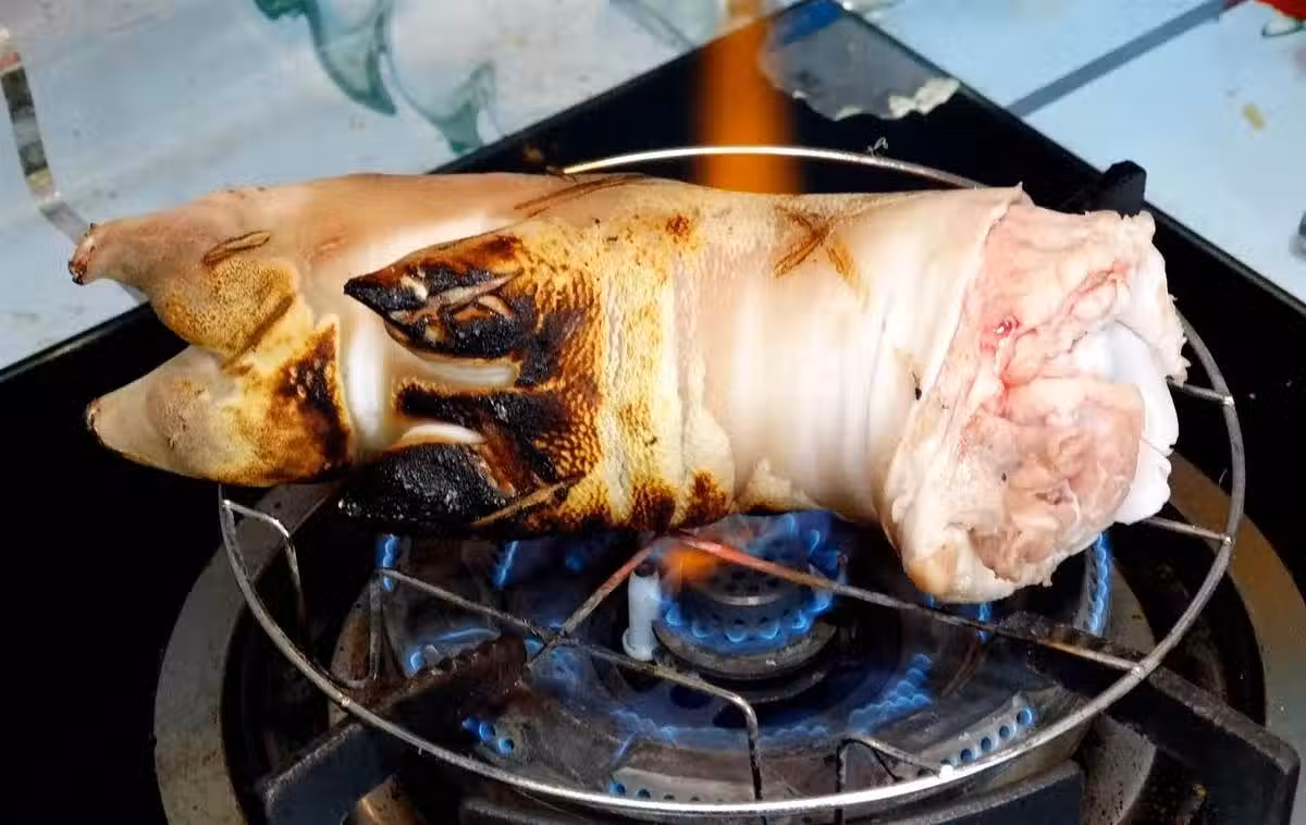 這樣做不光是為了除毛,燒一下豬蹄味道會更好,有焦香味道,能夠去除豬蹄的異味和腥味。