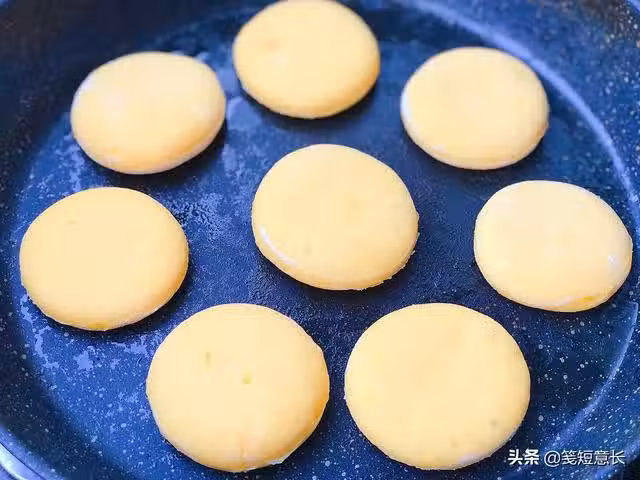 8、平底鍋小火熱鍋,刷一層薄薄的食用油,放入醒發好的南瓜餅生胚,全程小火將南瓜餅烙至兩面金黃。因為餅有一定的厚度,烙餅時蓋上鍋蓋燜一下更容易熟。
