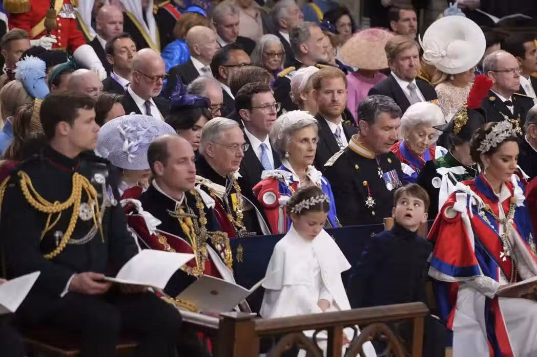 哈利(中)與鬧不和的哥哥威廉(前排左二)在父王加冕大典的座位保持相當的安全距離,可以不用互動。(美聯社)