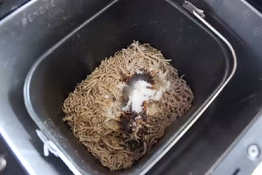 麵包機內桶加入一湯匙食用油,倒入撕好的肉絲,再加適量老抽,生抽,魚露,白糖,啟動麵包機的肉鬆功能。待最後20分鐘時加入白芝麻。(所有調料的量請根據個人口味酌量增減。不確定的話可以邊炒邊嘗。麵包機沒有肉鬆功能的可以用果醬功能)
