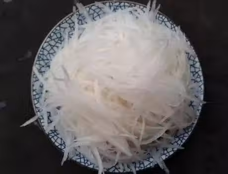 製作過程:第一步,首先準備一根白蘿卜,將其仔細清洗干凈後,削去白蘿卜的皮,然後將其切成細細的絲,切好的蘿卜絲放入一個容器中,加上點食鹽,用筷子攪拌均勻,靜置腌漬一會;