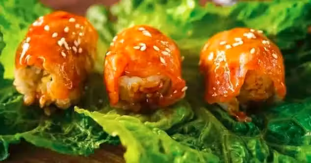 用裡脊肉片包住米飯,然後在玉米澱粉上滾一圈。