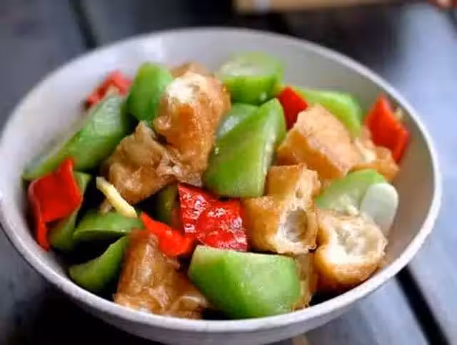 材料:絲瓜、油條、紅椒做法:1、紅椒洗淨去筋、籽後切菱形片。2、油條切大段。3、絲瓜去皮後切滾刀塊。4、鍋裡油熱後,放入姜絲爆香。5、倒入切好的油條段,絲瓜塊稍翻炒。6、沿鍋邊烹入適量清水蓋上鍋蓋,小火燜幾分鐘。7、撒入少許精鹽,翻炒均勻即可。5 絲瓜油麵筋