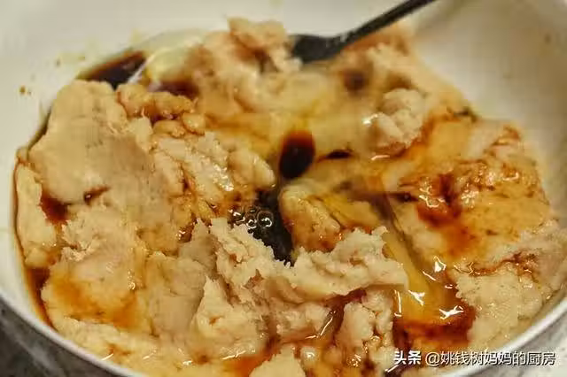 4、用手先將醬汁和雞肉泥拌勻,然後順時針方向上勁,雞肉泥變得粘碗即可。